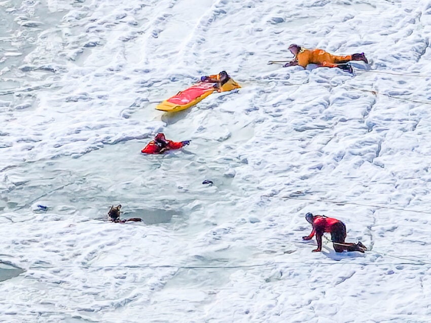 A woman died on Saturday while her husband remained missing on Sunday after the couple apparently fell through ice in Eastham and never resurfaced, police and fire officials said. The woman fell through ice at First Encounter Beach on Saturday morning, Chief Lisa Albino of the Eastham Fire Department and Chief Adam Bohannon of the Eastham Police Department said in a joint statement. Police received a call about a distressed, wet dog that was loose in the First Encounter Beach parking lot, the departments said. “An Eastham Officer arrived on scene and heard a woman screaming for help in the area of Bee’s River,” officials said. When first responders arrived at the shore, they saw a woman who had fallen through the ice about 30 feet from the shoreline, the officials said. Two police officers went onto the ice in an attempt to rescue the woman, but both fell through the ice and were unable to save her, the chiefs said. Both officers were able to make it back to shore safely, they said. Members of the Eastham Fire Department arrived at the shore, where staff entered the water in wetsuits designed for cold temperatures. During an initial search, the team was unable to locate the woman, the chiefs said. The Barnstable County Technical Rescue Team, the Barnstable County Dive Team, and drones from the Eastham Police Department were all called in to help with the search, the officials said. Divers found the woman at 11 a. m., and she was pronounced dead at the scene, the statement read. An investigation indicated that a man the woman’s husband was also at the beach with the woman as the pair walked their dog, the chiefs said. “It was determined that the male subject likely fell through the ice prior to the arrival of emergency personnel and did not resurface,” the officials wrote. The man was not found, even after a six-hour search that included a large dive team and underwater cameras. The search was called off at 5 p. m. until the next morning due to lack of daylight, according to the statement. The couple’s dog was brought to members of their extended family, officials said. Members of the Eastham fire and police departments returned Sunday morning to continue the search, conducting a search of the accessible parts of the shoreline and using a police drone, the police department said in an update. After two hours, the man had not been found, police said. “Additional search efforts will be conducted when changes to the ice conditions occur, allowing access for public safety personnel,” the department wrote. Officials are not publicly releasing the couple’s names at the request of their families, police said.